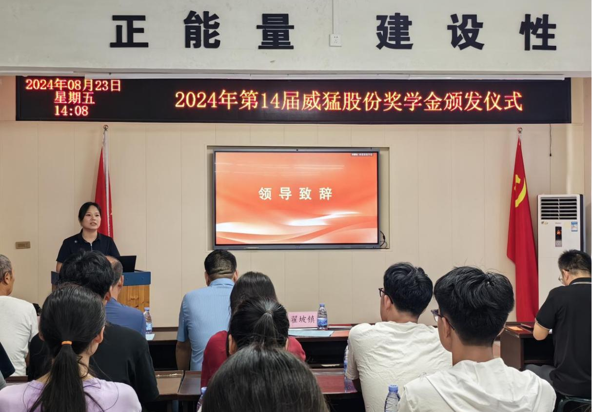 8月23日下午,威猛股份隆重舉行2024年第14屆獎學金頒發(fā)儀式。參加儀式的主要領導有翟坡鎮(zhèn)黨委書記張寒瑞,寺王村書記王澤平,南東村書記徐興濤,南西村副書記王明保,威猛股份總經(jīng)理王思民,迅焊公司總經(jīng)理