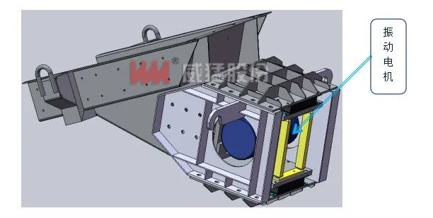 雙質(zhì)體振動(dòng)給料機(jī)(之后簡稱“給料機(jī)”)作為煤礦工況礦下用給料機(jī),應(yīng)用廣泛,得到許多相關(guān)客戶的青睞。但是,現(xiàn)場工況復(fù)雜,給料機(jī)的振動(dòng)電機(jī)存在拆卸不方便、維護(hù)不簡便,且維護(hù)更換存在吊裝困難的情況。如下圖所