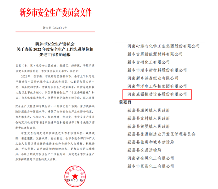2023年7月,河南威猛振動(dòng)設(shè)備股份有限公司被新鄉(xiāng)市安全生產(chǎn)委員會(huì)授予“2022年度市級(jí)安全生產(chǎn)工作先進(jìn)單位”榮譽(yù)稱號(hào)。此項(xiàng)殊榮,是新鄉(xiāng)市安全生產(chǎn)委員會(huì)對(duì)公司安全工作的高度肯定。威猛股份自成立以來,始