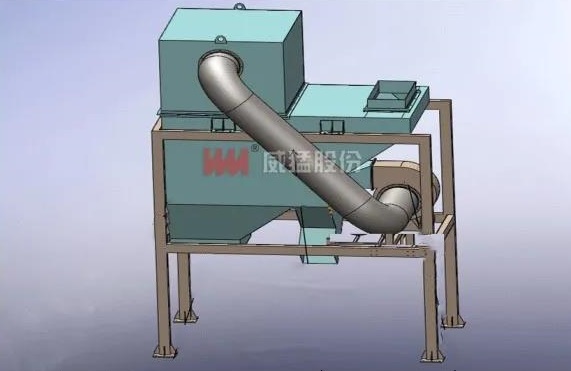 輕物質(zhì)分離器包括機(jī)架、風(fēng)管風(fēng)選箱及離心風(fēng)機(jī)等部分。風(fēng)選箱固定在機(jī)架上,風(fēng)選箱具有物料進(jìn)口、重物質(zhì)出口和輕物質(zhì)出口。風(fēng)選箱內(nèi)設(shè)有下料坡面,下料坡面的上端位于風(fēng)選箱的物料進(jìn)口處,下端與重物質(zhì)出口相連,下料坡面的背面連接有吹風(fēng)裝置。該設(shè)備在運(yùn)行時,物料從進(jìn)口進(jìn)入風(fēng)選箱,在重力的作用下,物料沿下料坡面自動滑落,物料滑落到重物質(zhì)出料口處時,吹風(fēng)裝置將建筑垃圾中的輕物質(zhì)吹到輕物質(zhì)腔里收集后處理,重物質(zhì)則通過重物質(zhì)出料口排出風(fēng)選箱。