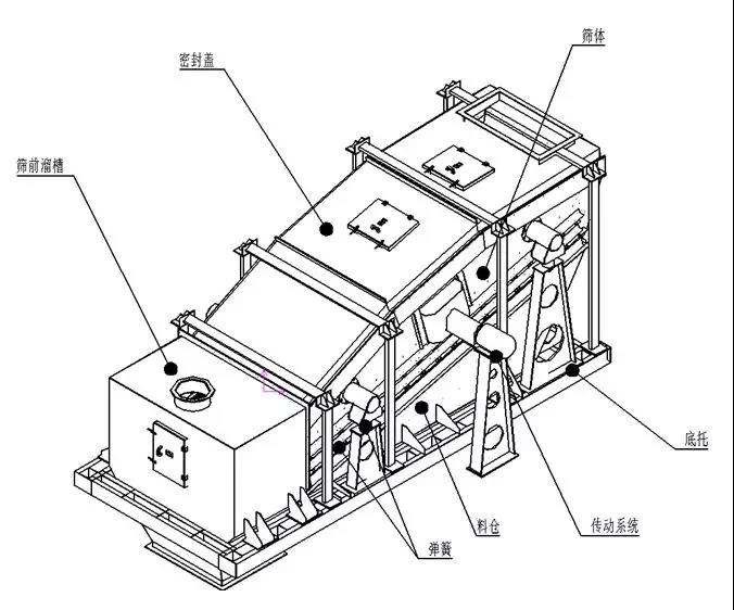 弛張篩是雙質(zhì)量振動(dòng)系統(tǒng),其中一個(gè)質(zhì)體是篩箱,另一個(gè)質(zhì)體是配重。在工作時(shí),篩網(wǎng)交替地拉緊和松弛,使物料產(chǎn)生前進(jìn)彈跳運(yùn)動(dòng),可避免物料黏附篩網(wǎng)并堵塞篩孔。當(dāng)兩質(zhì)體相差二相位振動(dòng)時(shí),任意兩根相鄰橫梁時(shí)而靠近,時(shí)而遠(yuǎn)離,彈性篩面也相應(yīng)時(shí)而松弛,時(shí)而張緊。這種弛張運(yùn)動(dòng)不僅使篩孔不斷產(chǎn)生變形,而且大大增加了篩面的振動(dòng)強(qiáng)度,從而有效地克服了篩孔堵塞現(xiàn)象,顯著提高了篩機(jī)處理能力。因此篩孔不但不易堵塞,而且篩分效率提高,處理量大,動(dòng)負(fù)荷小,功耗少,噪聲低。