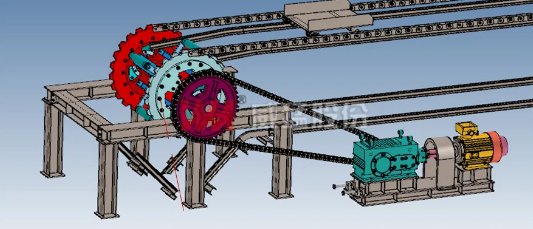 盤式多點卸料輸送機以板式套筒滾子鏈作為動力傳輸器件,鏈條與全部首尾相接的底部帶滾輪的臺車相連,并帶動臺車在設備所配的軌道上運行。