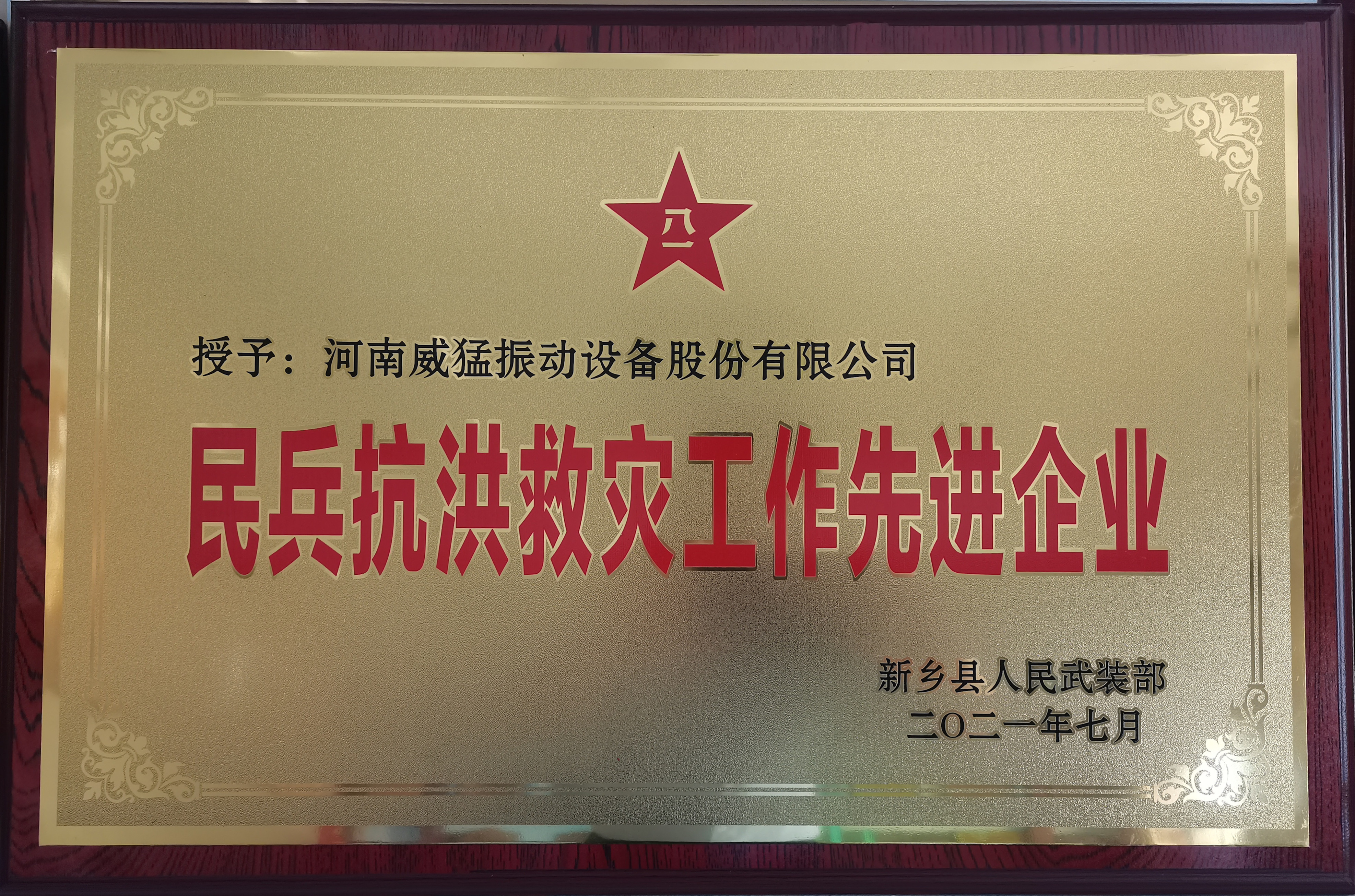 2021年7月30日,新鄉(xiāng)縣人民武裝部部長(zhǎng)張卓雅、政委宋利強(qiáng)等一行四人來(lái)到威猛股份,授予公司“民兵抗洪救災(zāi)工作先進(jìn)企業(yè)”榮譽(yù),公司總經(jīng)理王思民及副總經(jīng)理李惠萍進(jìn)行了接待。此項(xiàng)榮譽(yù)的獲得是縣武裝部對(duì)威猛